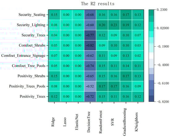 We used eight different regression models, namely ridge regression, lasso regression, elastic net, decision tree regression, random forest regression, SVR (support vector regression), gradient boosting regression, and K-nearest neighbor regression, to conduct regression analyses on EEG data and the top three ranked healing design elements in three types of emotions. As shown in Figure 12, the results reveal that the decision tree regression model best fits our data.