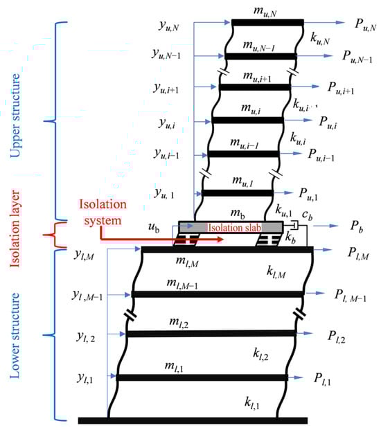 As shown in Figure 1, an inter-story isolated building with friction pendulum bearing (FPB) consists of an M-story LS, isolation layer, and N-story US. The mass, damping, stiffness, and external load on the i-th story of the LS are , , , and (i = 1, 2, …, M), respectively. The counterparts on the j-th story of the US are denoted as , , and (j = 1, 2, …, N), respectively. For the isolation layer, its mass, damping, and external load are , , and , respectively. The soil–structure interaction and dynamic interaction between adjacent structures are neglected in this study.