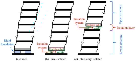 Fixed-base, base-isolated, and inter-story isolated building models.