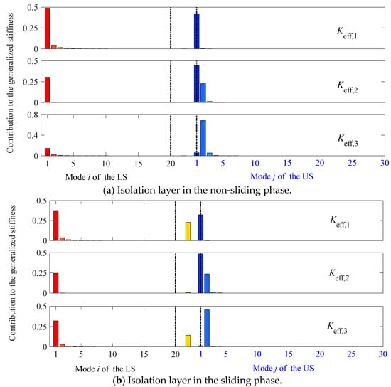 where is the k-th generalized stiffness of the original structure, is the equivalent stiffness of the isolation layer, and and are the i-th generalized stiffness of LS and the j-th one of US, respectively. is the mode vector corresponding to the undamped vibration of the original structure with full DOFs.
