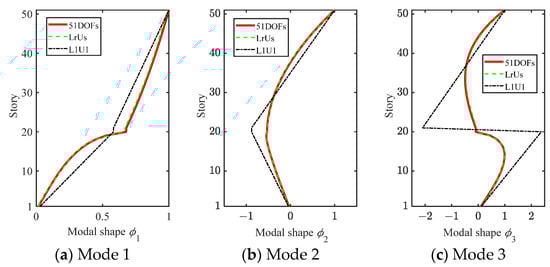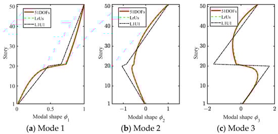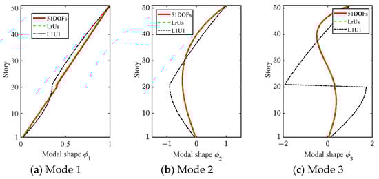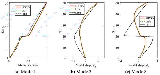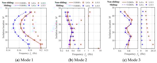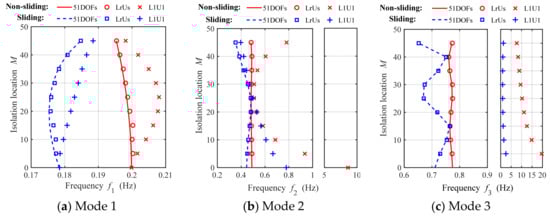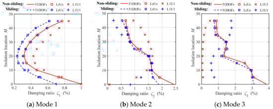 Figure 4 and Figure 5 show the variation in the first three frequencies and damping ratios for the simplified model LrUs with the different isolation location when the isolation layer is in the non-sliding or sliding phase. The results from 51DOFs and L1U1 models are also provided for comparison. In addition, Figure 6 and Figure 7 depict the first three mode shapes of the inter-story isolated building with M = 20.