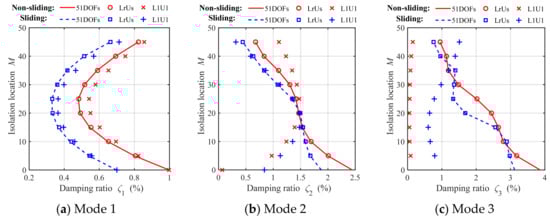 With the elevation in the isolation layer, the first modal damping ratio initially decreases and then increases, while the second and third modal damping ratios reduce on the whole. In fact, the modal damping ratios of the original building (51DOFs) are the combination of those of the LS, isolation layer, and US [].