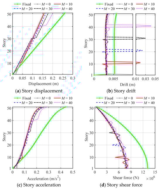 It is observed that the stories near the top of the LS exhibit a significant drift with the relatively low story stiffness, while the drift of the US can be effectively mitigated. With the rise in isolation location, the drift at the building top decreases greatly, and the largest drift at the isolation layer continues to grow. Because the structural response is dominated by the first mode, and the first modal frequency and damping ratio of the inter-story isolated building are always lower than those of the base-isolated building (as shown in Figure 8a and Figure 9a), the displacement, acceleration, and shear forces of the former are consistently larger than those of the latter. The maximal wind-induced response appears at M = 30, at which the acceleration and shear force approach the results of the fixed-base building. Similarly, due to the additional damping from the isolation layer, the story acceleration and shear force of the isolated building are, on the whole, less than those of the fixed-base building.