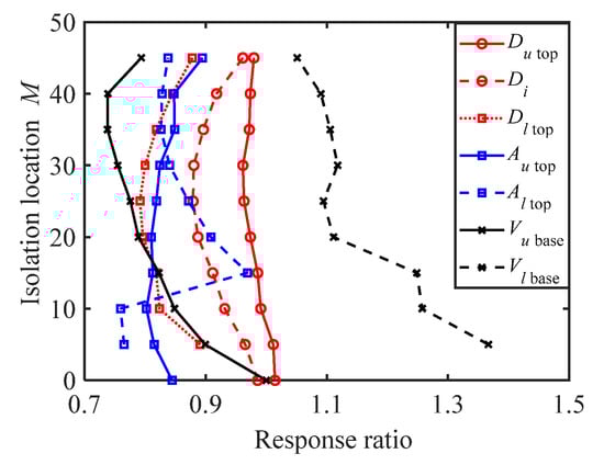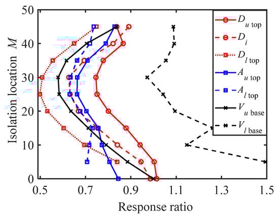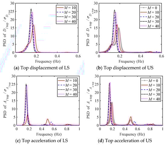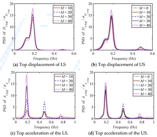 By use of the LrUs and L1U1 models, Table 3 summarizes the STDs of some important responses of isolated buildings with different isolation locations. These responses include top displacement of the LS, drift at the isolation layer, top displacement of the US relative to isolated layer, top accelerations of the LS and US, as well as base shear forces of the LS and US, which are denoted as Dl top, Di, Du top, Al top, Au top, Vl base, and Vu base, respectively. The ratios of structural response STDs obtained from the L1U1 and LrUs models are shown in Figure 14. Figure 15 provides the PSD of Dl top, Du top, Al top, and Au top normalized by their variances as M = 0, 10, 20, 30, and 40.
