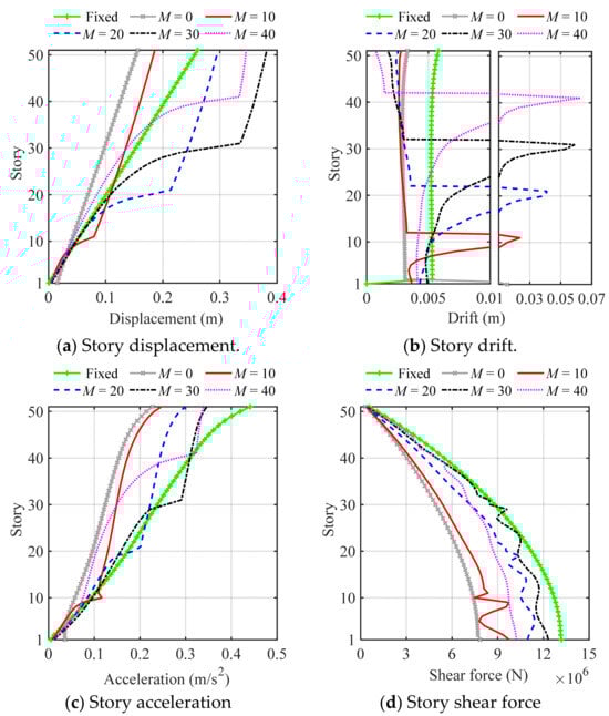 For the isolation location M = 10, 20, 30, and 40, the STDs of responses, including displacement, drift, acceleration, and shear force, of inter-story isolated buildings designed through scheme A to crosswind load with are portrayed in Figure 13. The corresponding results for a fixed-base building and the base-isolated building (M = 0) are also plotted, which are comparable with those in reference []. The STDs of the top displacements of the fixed-base building in this study and in reference [] are 0.26 and 0.23 m, respectively; and the STDs of the base shear forces of the base-isolated buildings shown in Figure 13d and in that reference are 7.84 × 106 and 8.12 × 106 kN, respectively. It is observed that the inter-story drift angle of the fixed-base building is 0.263/202 = 0.0013 < 1/550 (the limitation of the inter-story drift angle of the reinforced concrete frame structure []). The drift at the isolation layer increases with its elevation, while the story drifts of the LS and US remain almost at the same level. The story drifts of the LS adjacent to the isolation layer have a noticeable change, which leads to an obvious variation in the shear forces of corresponding stories. Apart from the isolation layer being positioned near the top, story accelerations change a little with the isolation location. The friction-induced energy dissipation of bearings increases the damping of the structural system [,]. Therefore, the responses of isolated buildings reduce significantly compared with those of the fixed-base building. For instance, the acceleration at the building top decreases by 44% and the shear force at the building base declines by 39% when the isolation location is M = 30.