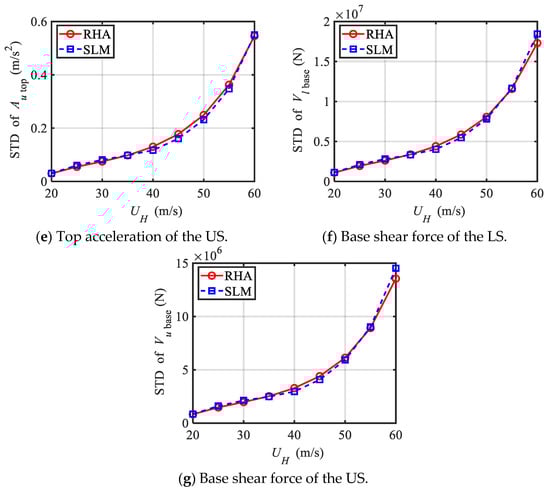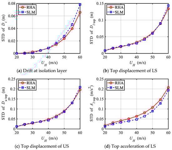 Taking the inter-story isolated building (M = 20) designed by scheme A as an example, Figure 19 compares the response STDs computed by response history analysis (RHA) and statistical linearization method (SLM) in the wind speed range . It can be observed that the SLM slightly overestimates displacement at the isolation layer at a high wind speed, while it underestimates the accelerations at the top of the LS, somewhat. The other structural responses have a great prediction.