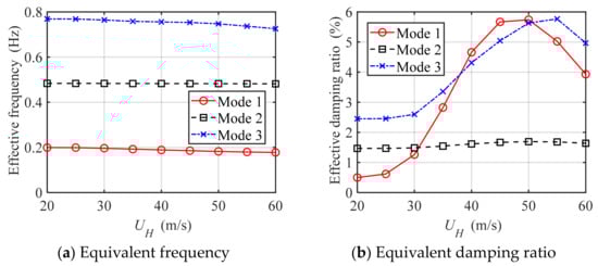 Through the eigenvalue analysis of state-space equation, i.e., Equation (16), the equivalent dynamic properties of the inter-story isolated building with nonlinearity can be obtained. Figure 20 provides the variation in the first three frequencies and damping ratios of the equivalent linear system with the wind speed. It is clear that the first and third frequencies of the building decrease slightly with the growth of , while the second frequency is almost unchanged. This variation is consistent with the result in Figure 4a where frequencies change with the bearing state from the non-sliding phase to the sliding phase. The friction-induced energy dissipation brings about a significant increase in the first and third modal damping ratios. It is the additional damping at the isolation layer, the wind-induced responses of inter-story isolated tall buildings are reduced, on the whole.