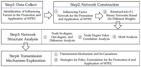 To address the transmission mechanism issue of influencing factors for the promotion of WPEC, this paper first establishes a classification framework for these factors. Based on this framework, the influencing factors for the promotion and application of WPEC are identified. Subsequently, an influencing factor network for the promotion and application of WPEC is constructed and converted into three binary networks based on edge weights. Using complex network analysis methods, this paper conducts node in-degree and out-degree difference analysis, node degree correlation analysis, and motif analysis to reveal the transmission mechanisms and the causes of these influencing factors, and proposes strategies for policy formulation for the promotion of and application of WPEC. The research framework of this paper is shown in Figure 1.