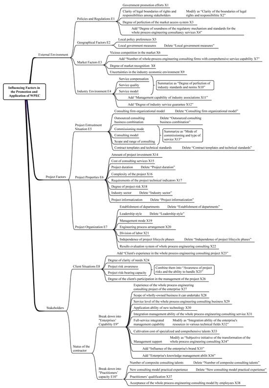 The rationality of the factors, identified in the preliminary screening, needs to be assessed. For this purpose, ten experts in the field of WPEC were invited to evaluate the rationality of these initially selected factors using the Delphi method and revisions were made based on their feedback. The revised factors for WPEC include 12 external environmental factors, 10 project factors, and 16 stakeholder factors, as shown in Figure 2.