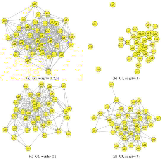 From this adjacency matrix, a directed weighted influencing factor network for the promotion and application of WPEC was constructed. For the analysis of this adjacency matrix and the overall structure of the network can be referred to in the literature []. Unlike the literature [], the focus of this paper is to divide the influencing factor network for the promotion and application of WPEC into three sub-networks according to the differences in the weights of the connecting edges, to provide a more in-depth analysis of the transmission mechanism of the influencing factors in the promotion and application of WPEC. In this network, the edges between nodes are defined as influence flows, the direction of the edges as the direction of the influence flow, and the edge weight as the degree of influence. The difference in strength between two nodes is defined as the influence potential difference. Influence transmission between factors manifests as a flow driven by the influence potential difference, moving through the influencing factor network, with a transmission strength measured by the degree of influence. Moreover, if a node in a network has a higher out-degree than in-degree, it is defined as an influence output source; conversely, if a node’s in-degree exceeds its out-degree, it is defined as an influence receiver.