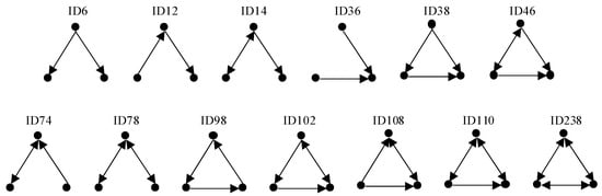 Motifs are small-scale subgraphs in complex networks characterized by high-frequency features, reflecting the micro-level operational patterns on which network formation and evolution depend []. Figure 4 shows the form and numbering of a directed subgraph composed of three nodes, which represent three-node motifs. The forms and numbering of four-node motifs and higher-order motifs can be found in the literature [].