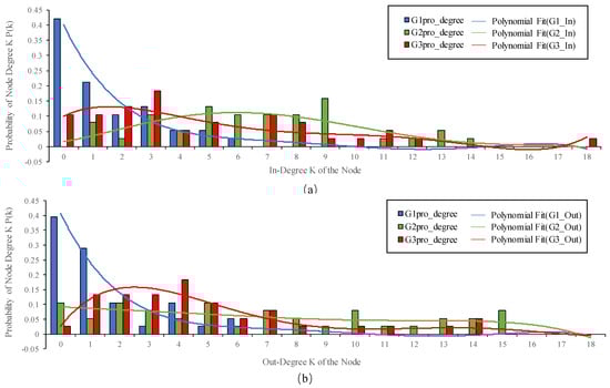 Degree Distribution of Nodes in the Influencing Factor Network for the Promotion and Application of WPEC. Panel (a) shows the in-degree distribution for the three binary networks and panel (b) shows the out-degree distribution. The horizontal axis represents the degree value of the network, the vertical axis represents the number of degree values, the bar graph indicates the degree values, and the curve is the fitting curve.