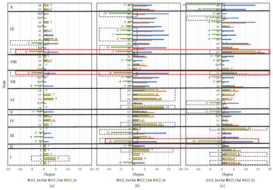 In-degree, out-degree, and their differences for nodes in the influencing factor network for the promotion and application of WPEC, where (a) shows the in-degree, out-degree, and their differences for the G1 network nodes, (b) for the G2 network nodes, and (c) for the G3 network nodes. The horizontal axis represents the degree value of the nodes, the vertical axis represents different nodes, and I to X denotes different regions to which the influencing factors belong. Dashed boxes indicate nodes in the network with a difference in in-degree and out-degree greater than 4, while solid boxes represent the overlap of nodes with prominent differences in in-degree and out-degree across the different networks.
