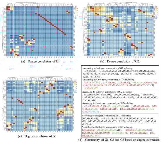 To further analyze the correlation of node degree values in the influencing factor network for the promotion and application of WPEC, this paper conducted a Pearson correlation analysis and then clustered the nodes based on the results of this analysis, as illustrated in Figure 7. The cluster results above the heatmaps in Figure 7a–c are based on the out-degree correlations for clustering the nodes, while the clusters on the left side are based on in-degrees. Figure 7d shows the clustering results for the G1, G2, and G3 networks.