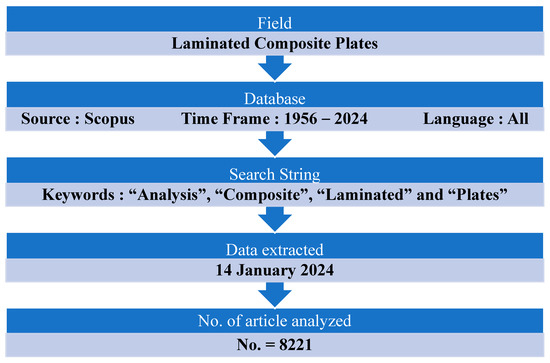 Bibliometric analysis is gaining prominence as a technique for determining the trend and pattern of studies [45]. The study patterns can be observed by classifying the publications by year, author, affiliation, or country. Additionally, the publication’s influence and performance can be quantified using matrices such as the number of citations, citations per year, h-index, and g-index [46]. The bibliometric search process was initiated by identifying pertinent keywords based on the search criteria, followed by the retrieval of results from various databases. Scopus was the primary search engine used due to its vast access to a large number of journals and its inclusion of resources for information analysis and bibliographic databases, which support the assessment and analysis of research performance. Additionally, it offers a range of analytical tools for conducting focused searches [47]. Covering documents published between 1956 and 2023, the search was conducted using the following query string; “Article title”, “Abstract”, Keywords “Analysis”, “Composite”, “Laminated”, and “Plates”. The analysis focused on journal articles within specific subject areas, including “Engineering”, “Material Science”, “Physics and Astronomy”, “Mathematics”, and “Civil Engineering”. After applying the specified filters, a total of 8221 articles were obtained and included in the bibliometric analysis and the data were extracted for all documents in this bibliometric analysis. The data were analyzed using two tools—Excel 365 and VOS viewer version 1.6.19 [48]—to determine the frequency of publication, visualize the bibliometric networks, and compute citation metrics. The diagram of the research methodology used to select and sort the related articles is shown in Figure 1.