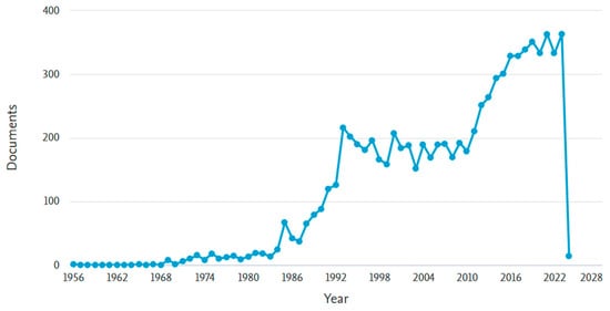 A discernible trend was revealed from the bibliometric analysis of the published research contributions on laminated composite plates up to 2023 (Figure 2). In the current work, the authors considered the period from 1956 to 2024 for analysis. The reason behind this was that more than 75% of the 8221 papers in this field were published in past few decades. Research publications have grown rapidly and reached above 5000 publications per year from 1992 onwards. So, it is observed that the rise has increased substantially in last 4 decades only. The number of articles has consistently increased since 1992, experiencing a notable steep surge starting from 2010 onwards. The majority of research in this field was conducted between 1992 and 2023, accounting for 7443 research publications out of a total of 8221 published articles. Also, the graph clearly shows that the interest of researchers in this particular field is increasing continuously. during the decade 2000–2010, the number of publications was around 1600; in the last decade (2010–2020), this number reached to 2000. Early in 1969, the number of publications was 8; however, it was recorded to be 363 in 2023. This indicates that there is high growth in publications. Furthermore, the number of research documents published within this scope peaked at more than 400 articles in 2022 and 2023, demonstrating their considerable impact, as illustrated in Figure 2.
