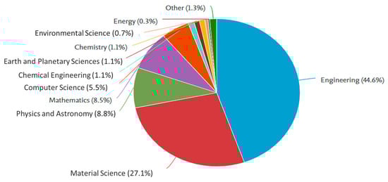 Figure 3 shows division on the basis of subject area, where Engineering has witnessed the most significant advancements in this particular domain, accounting for 44.6% of the progress. Martial Science contributed 27.1%, while Mathematics, Physics, and Astronomy, as a whole, maintained a dominant position at 17.2%. It can be observed that the major literature contribution came from Engineering, consisting of 7244 documents. Research in Material Science occupies the second rank with 4395 documents, followed by Physics and Mathematics with 1426 and 1378 documents, respectively.