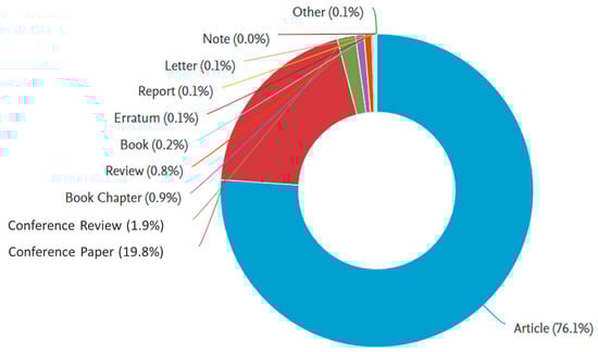 All document types like articles, books, conference papers, and review articles were considered for analysis without any exclusions. The “analyze the search results’’ function available in Scopus was used to scrutinize the literature. The search showed 8221 documents, out of which research articles occupied almost 76.1% of the database. The distribution materials released on laminated composite plates are summarized in Figure 4, divided into 14 document categories (Table 2). More than half of all publications (76.1%) were classified as articles, followed by conference papers (19.8%). Until now, four types of documents (short survey, editorial, retracted, and report) have had fewer than ten published documents, with other publications accounting for 10 to 70% of the total documents.