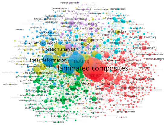 Figure 6 illustrates a bibliometric map that visualizes the co-occurrence of laminated-composite-plate-related keywords used in the literature. To mitigate the impact of heavily cited sources within the network, counting methodologies known as “Author Keyword” and “Fractional Counting” were employed in conducting the analysis by VOS viewer version 1.6.19. The threshold for minimum occurrences was established at 5, leading to the identification of 1566 keywords from a total of 9954. The size of the circles in the map corresponds to the frequency of keyword appearances, while the thickness of the lines indicates the strength of association between the respective terms. Additionally, the proximity of the two terms on the bibliometric map reflects the intensity of their relationship. Notably, the keywords with the largest nodes on the map, namely “laminated composites”, “plates”, “finite element method “, and “shear deformation”, demonstrate the highest degree of co-occurrence.