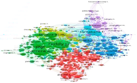 The co-authorship network was also investigated in the present bibliometric analysis using VOS viewer version 1.6.19. The analysis utilized a minimum criterion of two documents, resulting in 1329 authors meeting the criteria. Among them, only 160 authors were connected through the network, as depicted in Figure 7. Understanding the existing scientific collaboration networks in any field of study can provide researchers with easier access to funding, domain expertise, and valuable experiences. This can not only enhance productivity but also reduce isolation from the global scientific community. Ultimately, such collaborations can promote scholarly communication and lead to an increase in the volume of research output. Encouraging and supporting collaboration through research management and scientific policies has the potential to amplify research efforts, productivity, and impact [50].