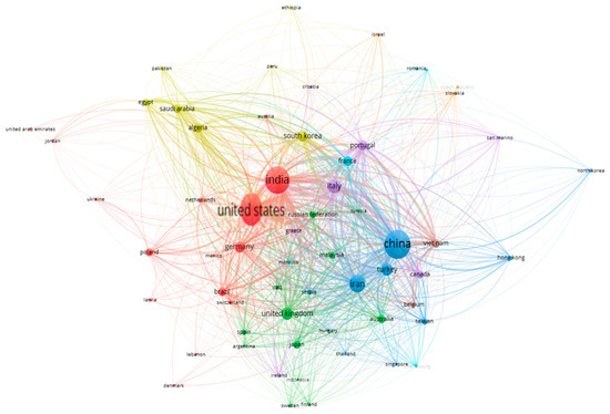 Using the author’s affiliations, VOS viewer version 1.6.19 was utilized to construct network maps. This observation underscores the significant contributions made by these countries in the field of analysis of laminated composite plates. The network map includes countries with at least eight documents, connecting 60 countries. The map revealed four distinct clusters of countries, as shown in Figure 8. Notably, the United States emerged as the country with the highest number of documents and achieved first place in overall link strength and linkages (1571), followed by China (1354) and India (1229). As seen by the contributions from these nations, the field of laminated composite plates has garnered significant interest from researchers.