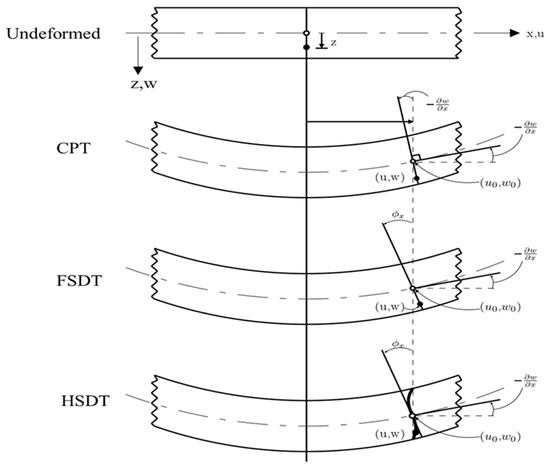 The key distinction among the theories is clarified in Table 4 and Figure 9, which illustrates the orientation of the transverse plane after deformation. In the scenario of CPT, the transverse plane maintains its perpendicular and straight alignment to the midplane surface both before and after deformation, resulting in the elimination of shearing strains (). In general, the theories used to analyze laminated plates may be divided into different major categories: (i) classical lamination theory (CLPT) [53], (ii) first-order shear deformation theory (FSDT) [54], (iii) higher-order shear deformation theory (HSDT) [55], (iv) layer-wise lamination theory (LWT) [56], (v) zigzag theories [57], (vi) 3D elasticity theories [58], and (vii) discrete-layer theories [59]. Each theoretical approach presented offers a unique perspective on comprehending the behavior of laminated composites. These theories cater to various levels of complexity and accuracy in their analyses, providing researchers with a range of options to study and understand the intricacies of laminated composites [60,61,62].