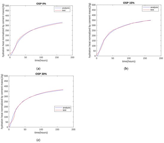 In this study, the proposed formula contains three parameters to be determined. Based on the experimentally measured cumulative heat of hydration, MATLAB 2024a software was used to regress and obtain the values of the undetermined parameters. The regression process is described as follows. First, based on the measurement results that do not contain oyster shell powder, the values of Q0, b0, and c in Equations (1) and (2) are obtained. Then, assuming that the values of Q0 and c remain unchanged, the value of b15 was obtained by using the test results of the hydration heat of the 15% OSP specimen, and the value of b30 was obtained by using the test results of the hydration heat of the 30% OSP specimen.