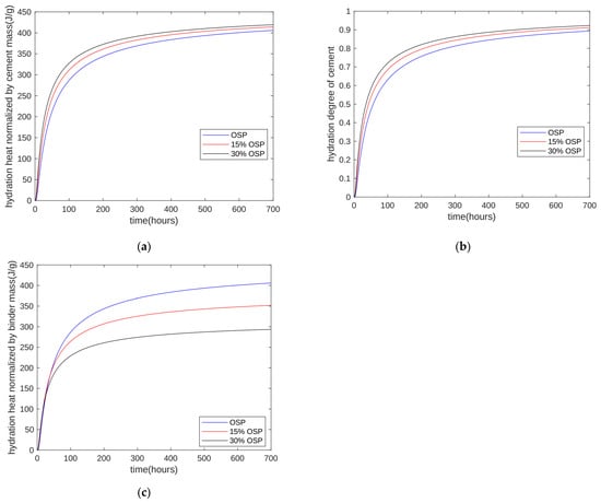First, using the experimental results of the first 7 days of isothermal hydration heat of 1 g cement and the three-parameters equation (TPE), the model result shows that, for all of the mixtures, the ultimate heat release of 1 g cement is 454.27 J and the shape coefficient of the TPE is −0.72, but the reaction rate parameter is different. For 0%OSP, 15%OSP, and 30%OSP, the reaction rate parameters are 12.89, 10.60, and 9.17, respectively. As the amount of OSP substitution increases, the reaction speed becomes faster, which is mainly due to the nucleation effect of OSP.