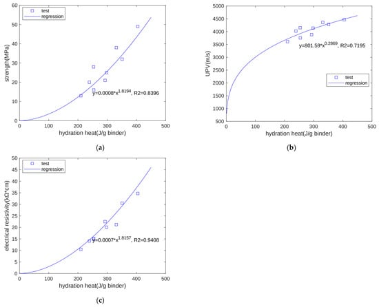 Figure 3b shows the relationship between UPV and the calculated hydration heat. For all three specimens at each of all test ages (3, 7, and 28 days), UPV is generally an exponential function of hydration heat. The coefficient of determination of regression is 0.7195.