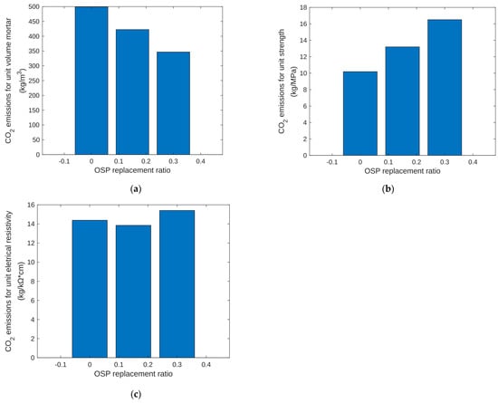 Third, combined with the emission of carbon dioxide, the CO2 emission corresponding to compressive strength and surface electrical resistivity units at the age of 28 days were calculated. The model result shows that, for 0%OSP, 15%OSP, and 30%OSP, the CO2 emissions corresponding to unit strength are of 10.18 kg/MPa, 13.20 kg/MPa, and 16.51 kg/MPa, respectively, but the CO2 emission corresponding to surface electrical resistivity units does not change significantly.