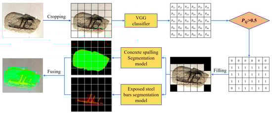 The input of the detection algorithm is a surface image of the RC structure to be detected. In order to clearly record the surface damage status of a structure, inspectors usually take photos with devices such as smartphones, portable cameras, or drones. Considering the limited computing power of the hardware device, the high-resolution structural surface image is cropped by a fixed-size sliding window into a partial image with a side length of 224 pixels. The input image should be padded with background pixels into an image with a side length divisible by 224 to ensure the accuracy and completeness of image cropping. This detection method combines an image classifier and two semantic segmentation models to perform different degrees of feature extraction and feature expression on the disease pixel groups in the structural surface image at the image level and the pixel level, respectively. Specifically, the image classifier built by the VGG network determines the probability that each image patch in the input image domain contains peeling and outputs the corresponding probability matrix . The probability matrix for judging the peeling area in the image domain is processed into a binary matrix through taking 0.5 as the probability threshold. Image patches that do not contain peeling are filled with solid color pixels for saving computational resources. Image patches containing exfoliation are used as input to the segmentation model for pixel-level classification. Both the concrete spalling segmentation model and the exposed steel bar segmentation model are designed to learn and capture the pixel features corresponding to spalling and steel bars in the input image, respectively. The semantic information expressing the two objects is expressed in the form of mask images. Ultimately, image fusion technology is employed to amalgamate the two types of disease information, namely concrete spalling and exposed steel bars, detected from the structural surface images.