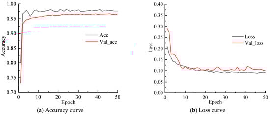 Figure 5. During training, the optimal model can be saved by monitoring the loss value on the validation set. Observing the training process of the model, it is not difficult to find that the image classifier begins to converge from the 20-th cycle, and the convergence value of the training set is slightly lower than the convergence value of the validation set, which are 0.091 and 0.100, respectively. In addition, the classification accuracy is used as an evaluation indicator of the quality of the training model. Likewise, the accuracy of image classification stabilizes after the 20-th training cycle. The classification accuracy of the training set remains at 0.975, which is slightly higher than the 0.950 of the validation set. It can be seen that the classifier can maintain high classification accuracy for the binary classification task at the image level. This provides a guarantee and support for the subsequent accurate segmentation of concrete spalling areas and exposed areas of steel bars.