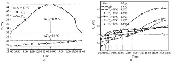 The roof’s top and bottom temperatures (a), Tw2 at Tm = 27 °C; (b) porous brick that filled with the air, and PCMs with varying temperatures of phase transition. TW1 and TW2 are the temperatures on the top surface of the roof and on the bottom surface of the roof. Reprinted with permission from Ref. [].