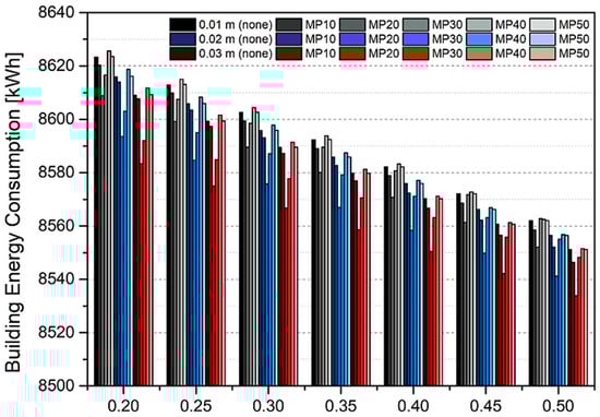 Lowering the surface temperature of the roof, improving interior thermal comfort, and increasing energy efficiency were all goals of the phase change material/wood–plastic (PCM/WPC) composite roof module system proposed by Chang et al. []. Increased reflectivity significantly reduces roof surface temperature, as indicated by thermal performance evaluations. However, due to a lower surface temperature, a higher reflectivity can increase the demand for heating and pose difficulties with freezing in winter. The surface temperatures were reduced by 7.37 °C thanks to the PCM/WPC roof module system. The decrease in surface temperature was observed to increase with PCM thickness. PCMs at 30 °C provided the best reduction in surface temperature, while PCMs at 20 °C improved thermal comfort and construction energy efficiency. Since the PCM was implemented externally in the building, economic efficiency, intended use, and reflectance should guide the choice of PCM type and thickness. Accordingly, a valuable reference for developing energy-efficient and comfortable buildings with enhanced thermal performance was approved in this study. Figure 5 illustrates that the house without the PCM/WPC roof module system used 8631.2 kWh for heating and cooling.