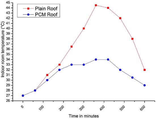 An experiment was carried out by Boobalakrishnan et al. [] to reduce the interior temperature of a one-story industrial structure with a metal roof using a PCM based on paraffin. This approach aimed to reduce the building’s cooling load and minimize traditional electricity usage. An investigation was conducted using a scale model of the suggested skyscraper. The experiment involved comparing a roof with encapsulated paraffin as the PCM to an uncoated roof. The tests revealed that encapsulating the PCM in the single-story structure’s metal roof significantly lowered the outside, inner, and inside temperatures. In this regard, encapsulating the PCM within the roof meaningfully mitigated the outer roof temperature by 7.5 °C throughout peak solar hours, and by 1.5 °C on average. The PCM also aided in reducing the inner ceiling temperature by 12.5 °C throughout peak solar hours, and by 5.5 °C on average. In contrast, without the PCM, interior temperatures rose rapidly. However, the paraffin-integrated roof exhibited lower daytime temperature changes. Figure 6 illustrates that the uncoated roof reached 44.5 °C after midday, whereas the PCM roof could not surpass 34 °C.