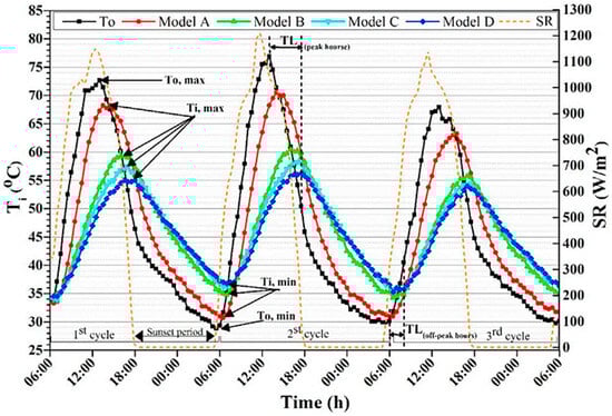 Al-Yasiri et al. [] conducted tests to determine the optimal location for a PCM-incorporated composite roof in Iraq. Common roofing materials in Iraq include gypsum board (8 mm), Isogam (4 mm), and concrete (50 mm). Four models were developed and evaluated, with Model A serving as the reference roof, while the other three included PCMs. In Model C, a PCM was placed between the Isogam and concrete; in Model D, between the concrete and gypsum board; and in Model B, within the concrete layer. Indicators such as heat flow reduction, decrement factor, time lag, average temperature variation, and maximum room temperature were examined. Model B demonstrated a greater reduction in conductive heat flow compared to Model A, followed by Model C and Model D. The results demonstrated that the optimal position for a PCM in a composite roof under hot climate conditions is between the finishing and the main roof layers. The model with a PCM in this position attained an optimum reduction in room temperature of 12.9% and an average temperature fluctuation reduction of 8.4%. Figure 8 illustrates that Model B’s maximum heat flow reduction in Case I was 49.9% in the initial cycle and 64.6% in the fourth cycle in Case II.