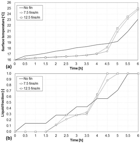 By simulating the suggested cooling panel numerically, Lim et al. [] were able to determine the optimal design of the PCM layers to maintain the panel’s surface temperature set-point constant while it was operating, all without using TEMs. The critical design factors for the cooling effectiveness of the PCM-TERCP (thermoelectric radiant cooling panel) were identified using parametric analysis. The layer thickness and the number of heat fins inside the PCM had a significant influence on the panel’s surface temperature. For conditioned space applications, the most practical PCM-TERCP solution was a thick layer (10 mm) of PCM with over five panel heat fins per unit length (Figure 9). Additionally, the PCM liquid’s percentage should be around 0.6–0.65 to optimally utilize its latent heat by improving heat transmission.