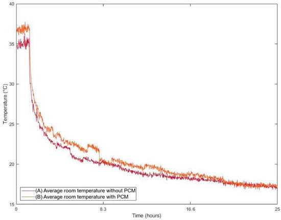 Velasco-Carrasco et al. [] examined how S23 ceiling panels improve building performance. A test room was artificially heated to determine the melting point of the PCM panels. S23 panels absorbed and raised the ambient temperature by 5 °C. PCM ceiling tiles assist in maintaining sustained room temperatures up to (+1.5 °C) during cooling. After 6 h of cooling, the S23 panel temperature dropped below its melting point, completing the thermal cycle. Additionally, the S23 panel can safely encapsulated the PCM and enhanced the exchange of heat with the thermal atmosphere, making it ideal for building inclusion. The results also demonstrated that the thermal conductivity of the S23 panels varies between 0.19 and 0.24 W/(m K), which is a competitive option if compared to other commercially available PCMs. The room temperature of the PCM declined to 14.6 °C during the initial 6 h, reaching 22.1 °C, below the melting point of PCM, as illustrated in Figure 10.