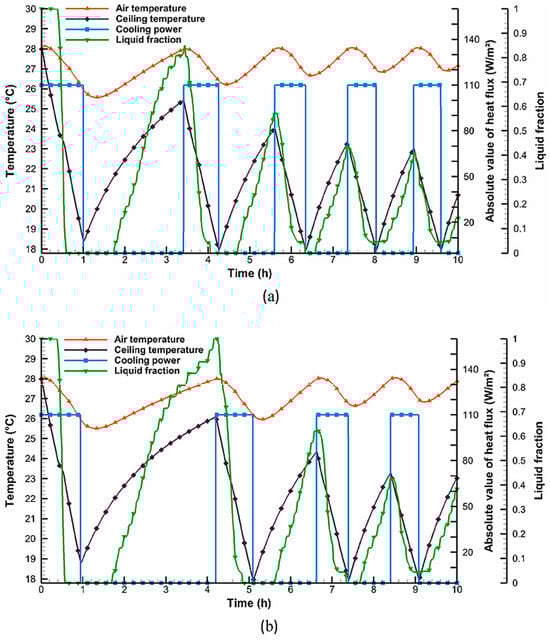 Mousavi et al. [] tested a system of PCM-RCCs in a full-scale examination cabin using panels of PCM for thermal efficiency and energy performance. The cooling energy provided through the cycles of charging–discharging and the PCM ceiling panel transient thermal behaviour were explored. The PCM panels were completely recharged after 4–5 h of cold-water movement overnight. And over 80% of the time of occupancy was categorized as “Class B” thermal comfort under the ISO 7730 standard. The majority of the power of system use occurs in the off-peak hours, almost 70% of the overall utilisation. Also, the governing timetable reacted to the conduction of the transient heat of the indoor space as well as the ceiling panels of PCM, but a further dynamic, predictive timetable is needed for improving the efficacy of the system and the indoor thermal comfort in reaction to the changing ecological circumstances.