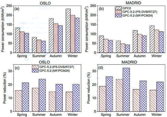 Cao et al. [] studied the performance of geopolymer concrete (GPC) walls with a micro-encapsulated phase change material (MPCM) in a range of architectural environments. Increasing the amount of MPCM as well as the thickness of the concrete walls improved the building’s energy efficiency. Building energy efficiency has been enhanced by employing a PCM with a melting point that is comparable to typical indoor and outdoor temperatures. A numerical calculation was made to determine the effectiveness of GPC using two MPCMs, namely PS-DVB/RT27, with paraffin Rubitherm® RT27. Additionally, electricity use and savings are greatly impacted by the wall direction and the time of year. The results in Madrid are better for MPCM-containing GPC than those in Oslo (Figure 13). The model is capable of quantifying the MPCM–concrete wall design in various climates.