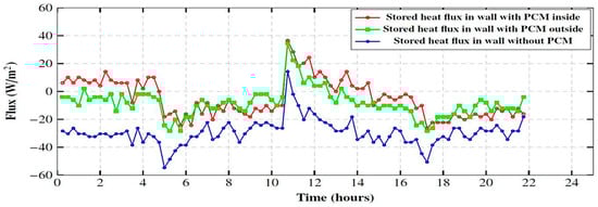 Elawady et al. [] examined the thermal behaviour of PCM-coated roofs, comparing different PCMs. Enthalpy–porosity and simplified thermal models are needed to simulate the melting of the PCM layer, with the simpler model being preferable for long-term modelling. Roofs with three different PCMs and various thicknesses were tested. In the hot summer climate of Aswan, Egypt, simulations were conducted on roofs with and without PCMs over an extended period. The use of PCMs in roof construction reduced internal heat flux and brought the temperatures of interior walls to the desired level. Increased PCM thickness improved performance. A four-month simulation projected an average inside-wall temperature of 32.5 °C for the roof without PCMs and 29.4 °C for the roof with PCMs. Over the course of four summer months, a roof structure incorporating 40 mm of RT31-PCM reduced the energy gain by 40%. This study demonstrated that the using of long-term simulations is vital to capture the melting and solidification behaviour of PCMs over a longer period.