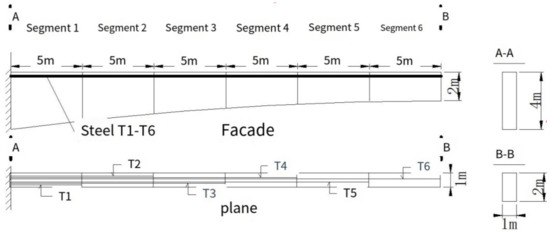 A specific cantilever beam, comprising six segments and spanning 30 m, with each segment being 5 m long, was simulated using the finite element method through six construction stages. The beam’s cross-section is rectangular, transitioning gradually in height from 4 m to 2 m in two parabolic stages, with a constant width of 1 m. The material used is C50 concrete, reinforced with prestressed steel strands labeled T1 to T6, with a tensile stress value of 1395 MPa. The distance between the center of each steel strand and the upper edge of the section is 15 cm. The construction layout of the cantilever beam is depicted in Figure 3, while a simulation model is created using the finite element software Midas/Civil 2019, as illustrated in Figure 4.