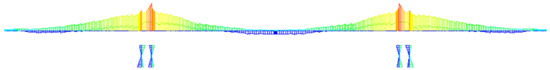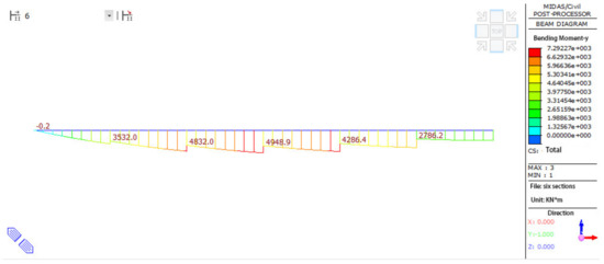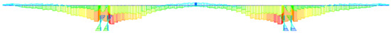 Comparison of Figure 11 and Figure 12 reveals that the bending moment envelope diagram presented in this paper aligns more closely with the expected internal force distribution of the completed bridge. It demonstrates a larger positive bending moment reserved at the beam’s root and a larger negative bending moment at the mid-span. Consequently, the prestressed tendons proposed in this article appear to be more logically designed.