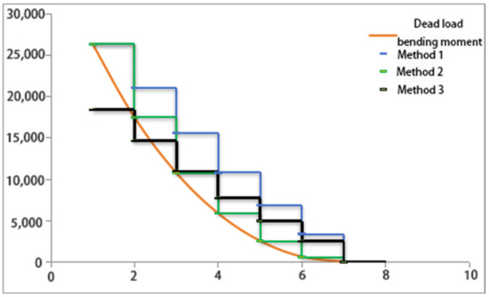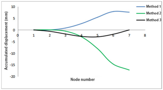 (4) Comparative analysis: The cumulative bending moment and displacement results from Methods 1, 2, and 3 are illustrated in the bending moment envelope diagram in Figure 8 and the cumulative displacement diagram in Figure 9.