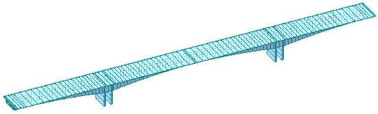 Bridge A is a continuous rigid frame with a total span of 3166 cm, comprising sections of 83 cm, 150 cm, and 83 cm. It features a half width of 22.63 m. The main beam section consists of a single box double chamber, with a box chamber width of 13.65 m and a cantilever flange plate width of 4.49 m. The root beam height of the box girder measures 8.50 m, while the midspan section beam height is 3.00 m. Both the height of the box girder and the thickness of the bottom plate vary according to a parabolic curve, with a multiplier of 1.8. The bottom plate thickness ranges from 30 cm at the midspan to 100 cm at the root of the box girder. The model is depicted in Figure 10.