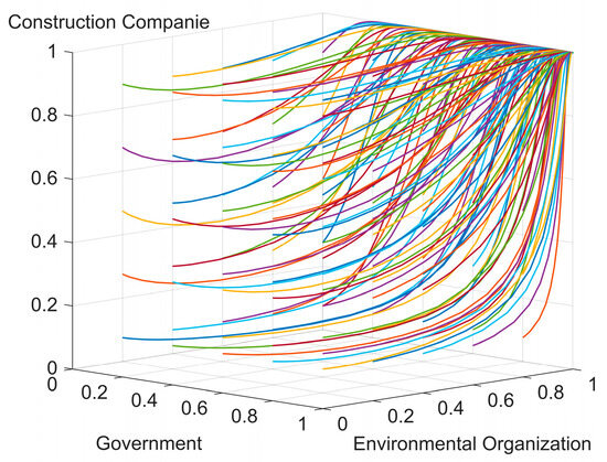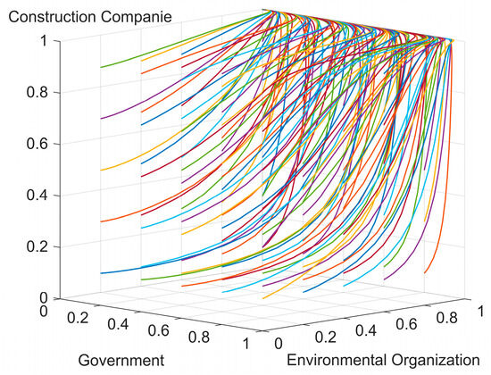It can be seen that a moderate increase in the government’s rewards and penalties for environmental organizations and construction firms is conducive to the evolution of the system in a positive direction, but excessive rewards can simultaneously increase financial pressure and reduce the government’s incentive to regulate.