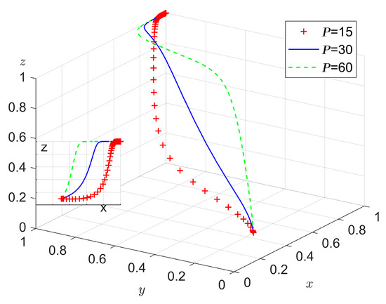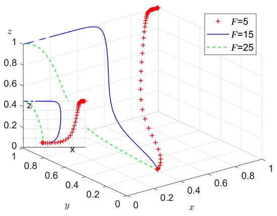 In Figure 6, it can be seen that the system evolution is stable when F = 5 and at the point (0, 1, 1) when F = 15 and F = 20. The speed of the government’s evolution towards a less stringent regulatory strategy increases when F increases. When F = 15, the government evolves towards strict regulation upfront but eventually chooses to stabilize at less strict regulation. This indicates that the government is initially willing to invest in regulation, but the cost of regulation is too large, resulting in negative regulation.
