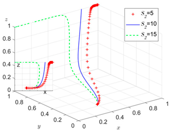 As can be seen in Figure 9, in the process of S2 gradually increasing, the decision-making of environmental protection organizations gradually tends towards the evolution of positive regulation, and vice versa. The government’s enthusiasm to participate in regulation is greatly reduced. It can be seen that at S2 = 15, the decision-making evolution of the system is stable at (0, 1, 1). This indicates that enhancing the government’s reward for environmental organizations’ participation in regulation is certainly conducive to enhancing their motivation, but it has a negative impact on the government’s own decision-making.
