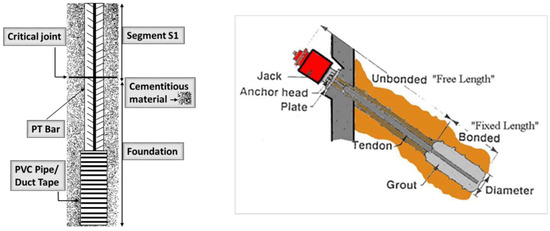 The application of hybrid bonded tendons involves a modification of the traditional bonded system. In the traditional approach, the tendon is encased in a corrugated tube, and cementitious materials are injected after applying a prestressing force. In the hybrid approach, bonded–unbonded properties are integrated into each tendon of PSBCs using a similar method. However, the cementitious material is applied only to specific regions of the tendon, while other sections remain unbonded. This is achieved by covering designated areas of the tendon with PVC pipes or duct tape, preventing contact with the surrounding concrete, and maintaining an unbonded status, as depicted in Figure 1.