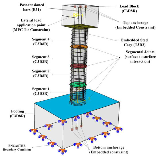 During the tests, the footing was fixed to the stable floor using two high-strength rods placed through the footing and anchored into the floor. The ENCASTRE boundary condition, having translational (Ux = Uy = Uz = 0) and rotational (UR1 = UR2 = UR3 = 0) degrees of freedom for all the nodes of the bottom surface, was utilized to simulate the fixed boundary conditions, as shown in Figure 3. The rocking columns experience joint opening/closing behavior under lateral cyclic loadings. In order to simulate this behavior, the surface-to-surface contact elements were defined. The interaction between the concrete surfaces was modeled by normal contact, with default constraint enforcement and hard contact pressure over-closure having finite sliding. The tangential contact behavior between the master and slave surface was modeled by tangential friction; the tangential friction was assumed to be 0.5, as proposed by Dawood [52], between the segments. The surfaces developed compression when in contact with each other and were allowed to separate without resistance.
